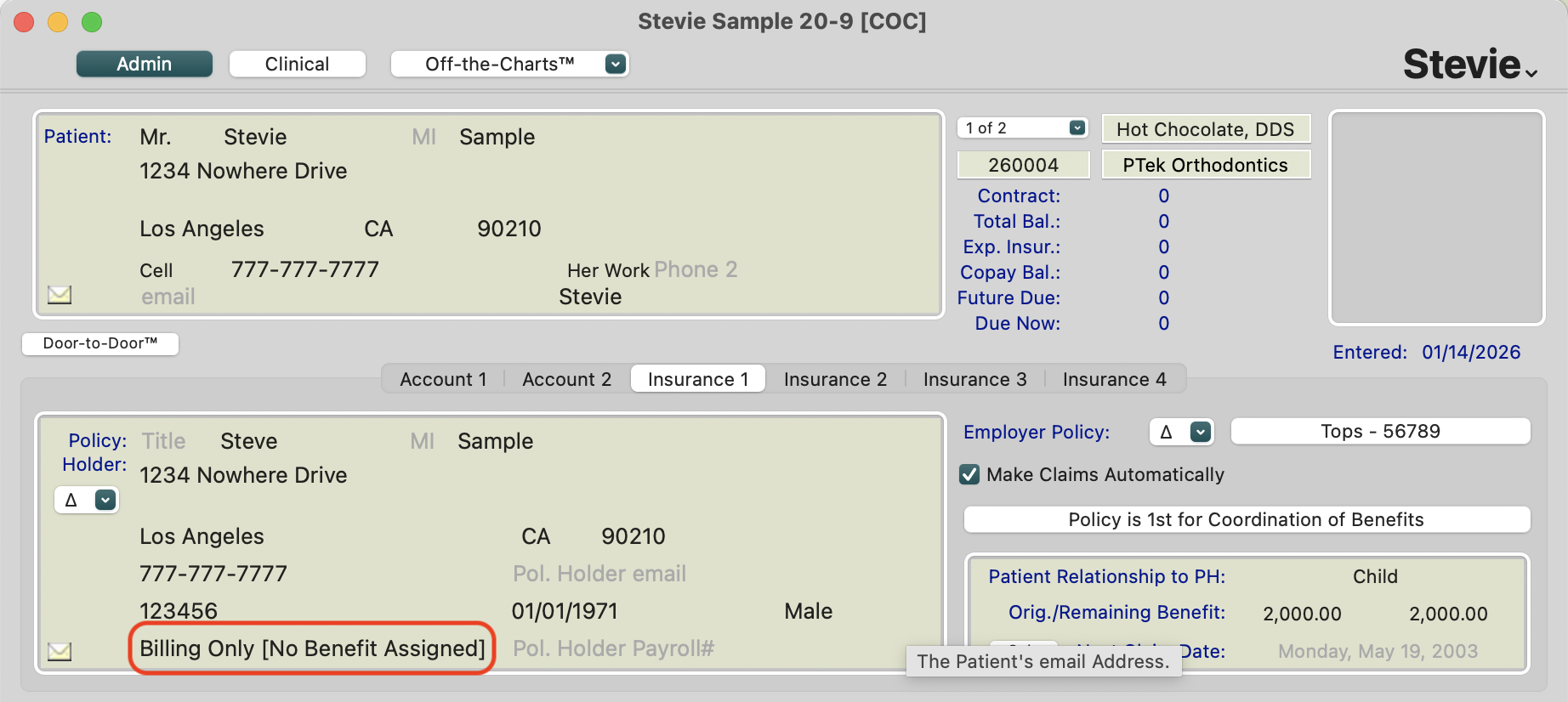 Add the policy holder information to the patient's chart, and identify the Assignment of Benefit as Billing-Only [Benefit Assigned].