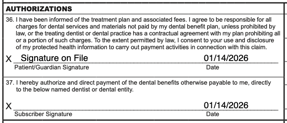 The claim generated will not reflect Signature on File in Box 37, since the orthodontist is not receiving the payment.