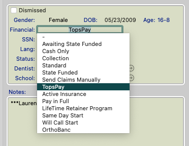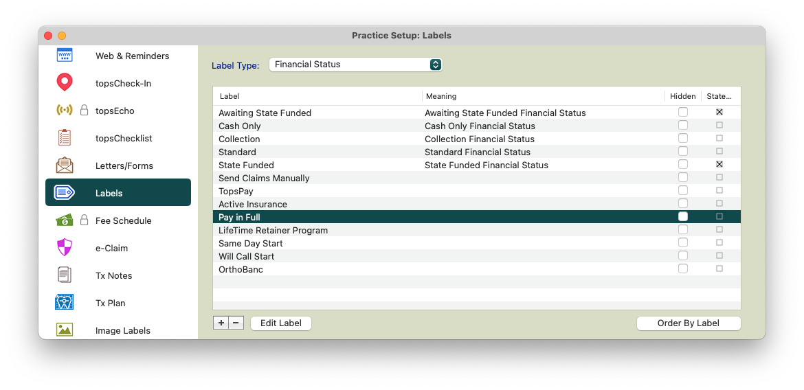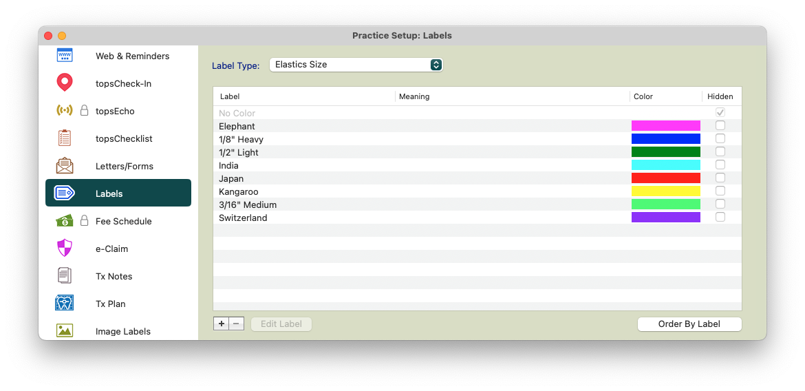Labels give you the flexibility of adding, deleting and editing many of the labels that are used throughout Tops Ortho. When you select a label category with the drop down arrow, click on the category that you would like to edit. If you are able to add or delete, the plus and minus symbol will be available on the bottom left of the window. If these symbols are grayed out, you may not add or delete an item.
