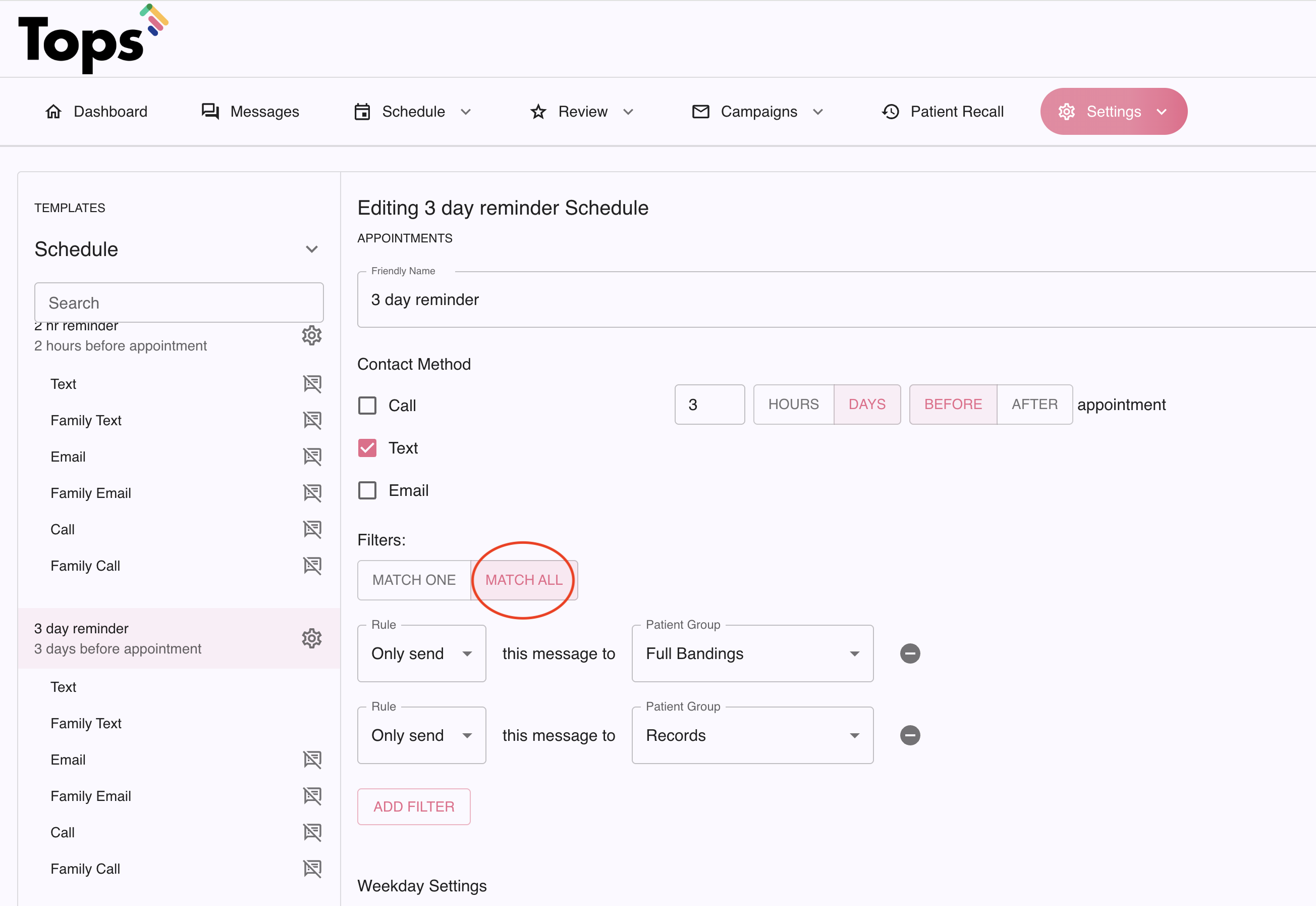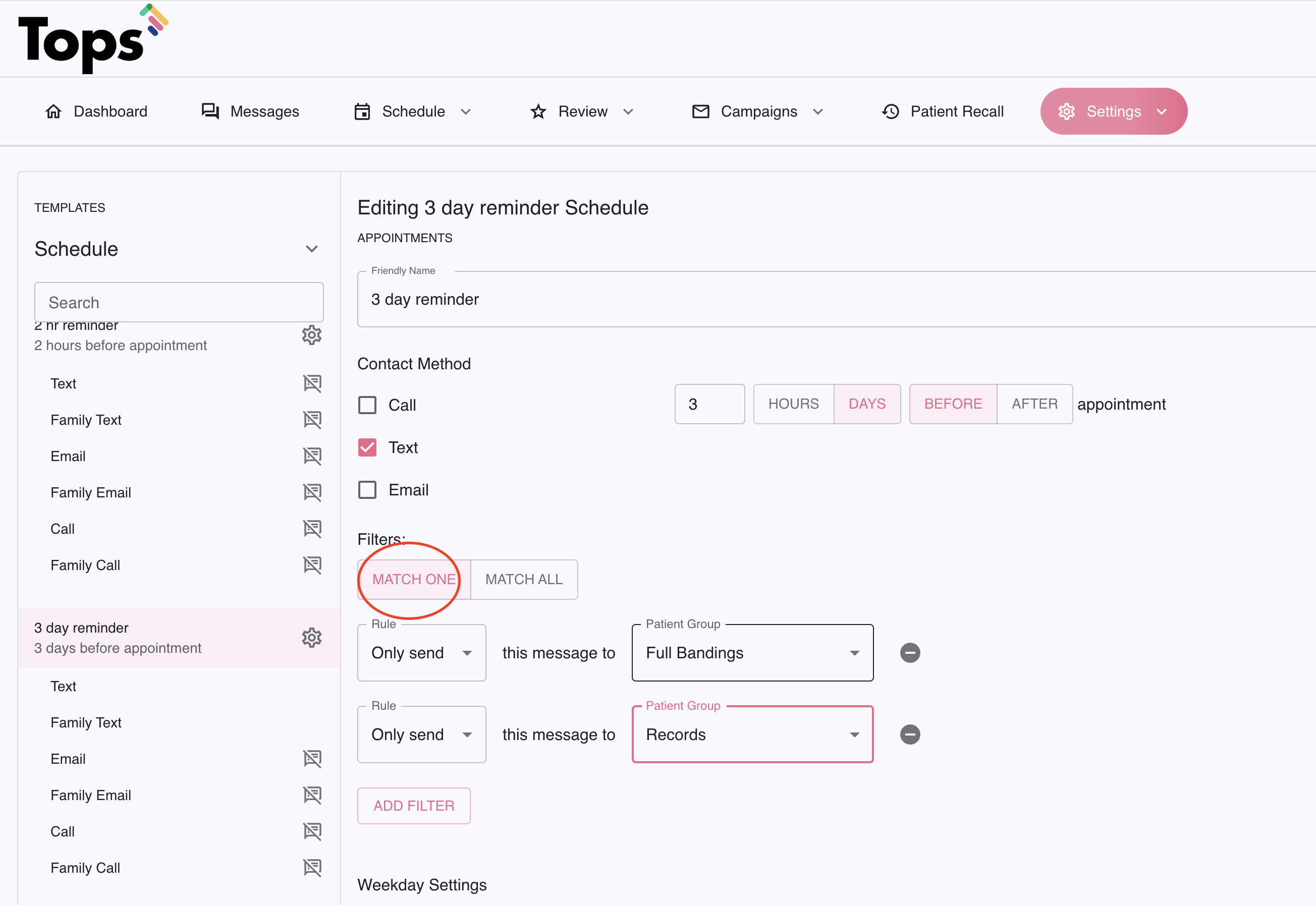 If you have more than one filter, and the setting is set to Match One, Tops will only send or not send ( setting filters are Only Send or Do Not Send), to patients that have an appointment type that is included in at least one of the listed Patient Groups.