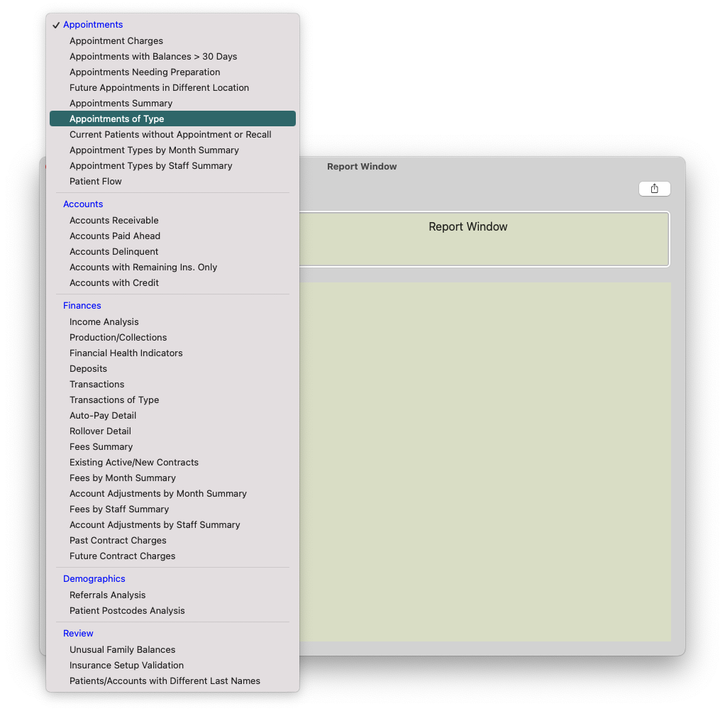 Within the Reports menu, there are several reports that can assist with analyzing your appointment types.