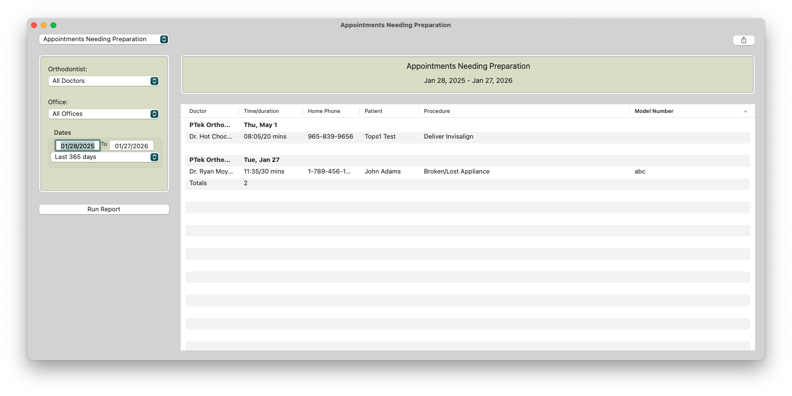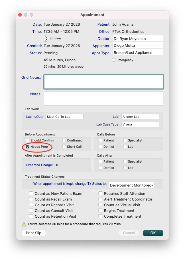 Lists all appointments for a specified date range with “Needs Prep” checked in the Appointment Confirmation window