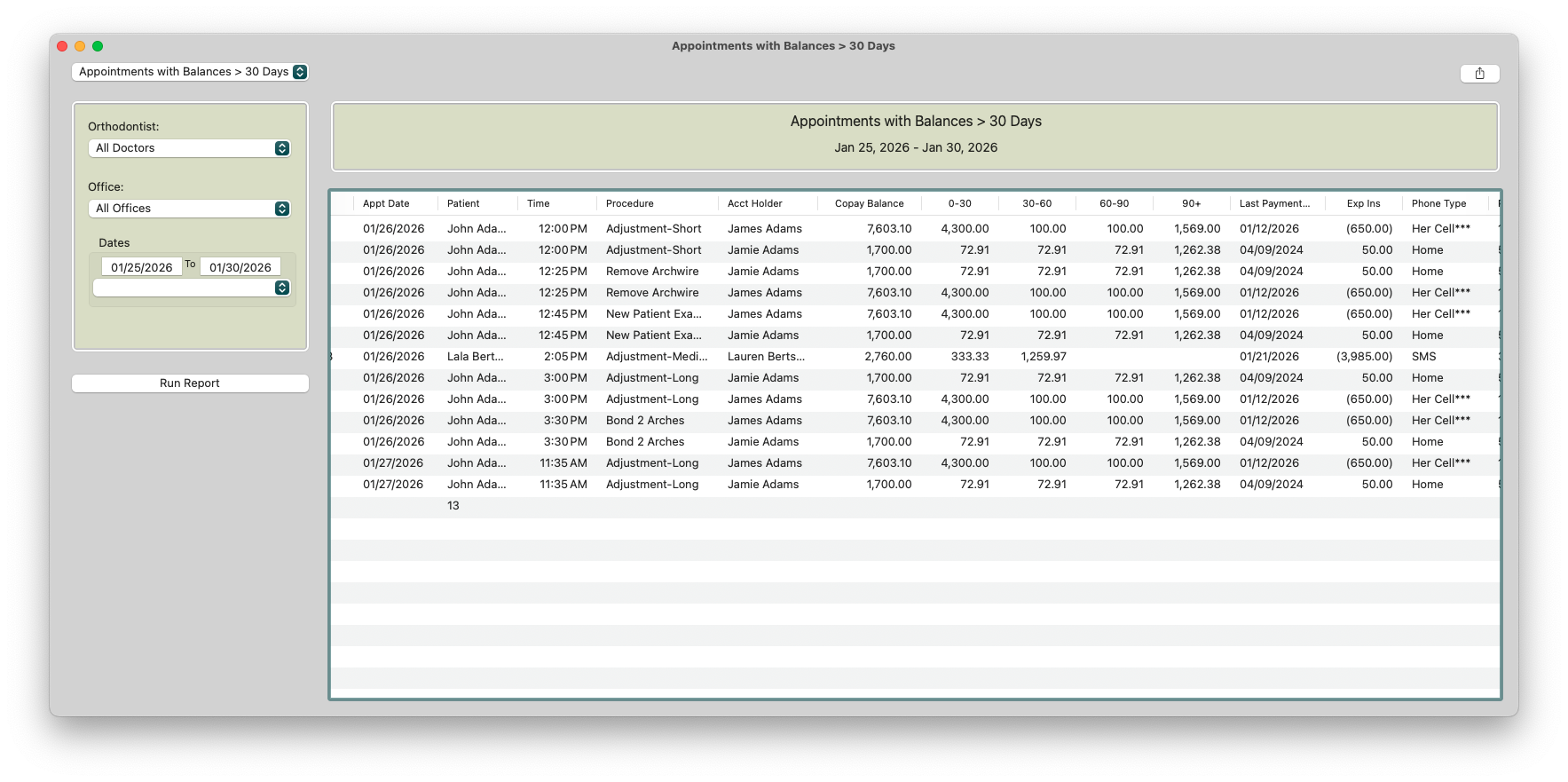 - Go to Reports > Appointments with Balances > 30 Days.