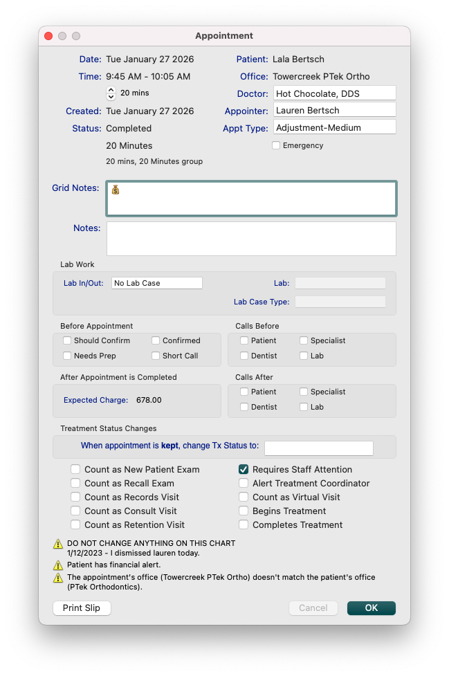Place a checkmark in the Requires Staff Attention checkbox. It may also be helpful to place an emojii 💰or financial note in the Grid notes for visual reference that a balance needs to be paid. When the patient checks in, they will receive a prompt to go to the front desk to discuss financials.