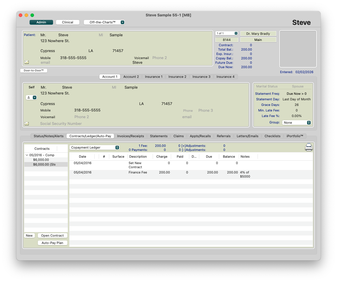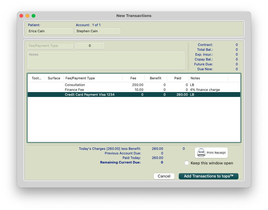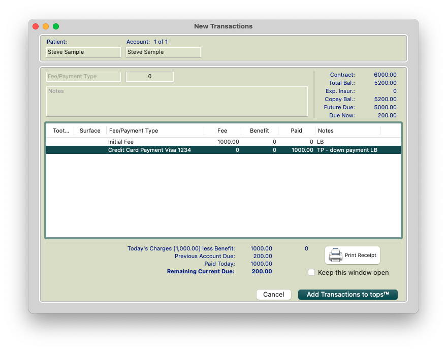 Open the Transaction Window (Command-T) and post a Finance Fee to the patient's ledger. For this example, 4% of the $5000 financed is $200. The patient should now reflect a Due Now balance.