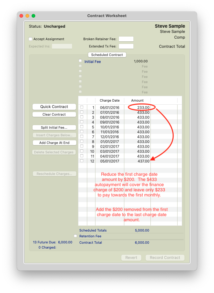 Create the autopay plan for a Total Plan balance of $5200. The first payment will cover the $200 finance charge reflected in the Due Now. The remaining $233.00 will apply towards the first charge date from the contract. At this point it is best to reduce the first charge amount to reflect $233.
