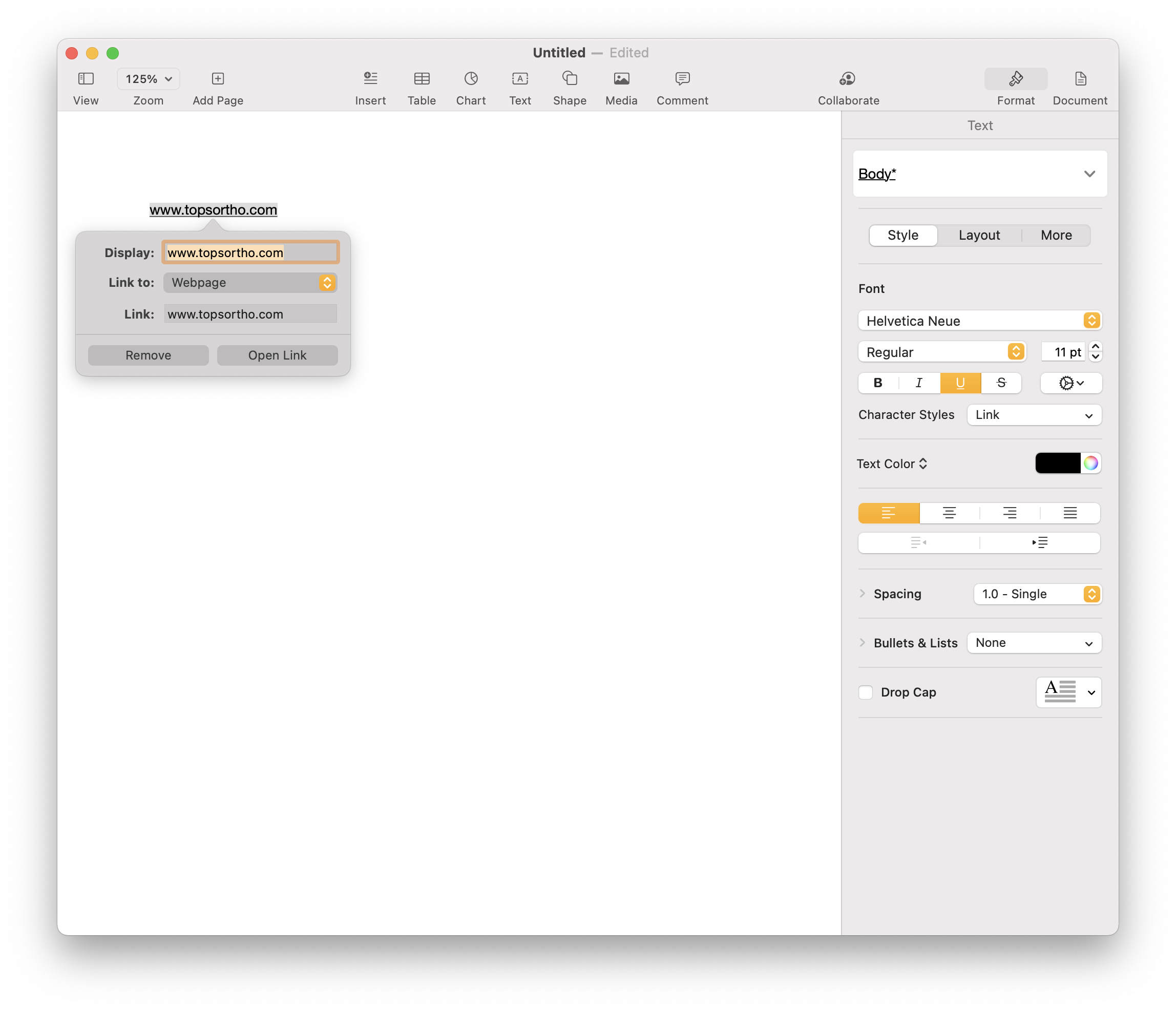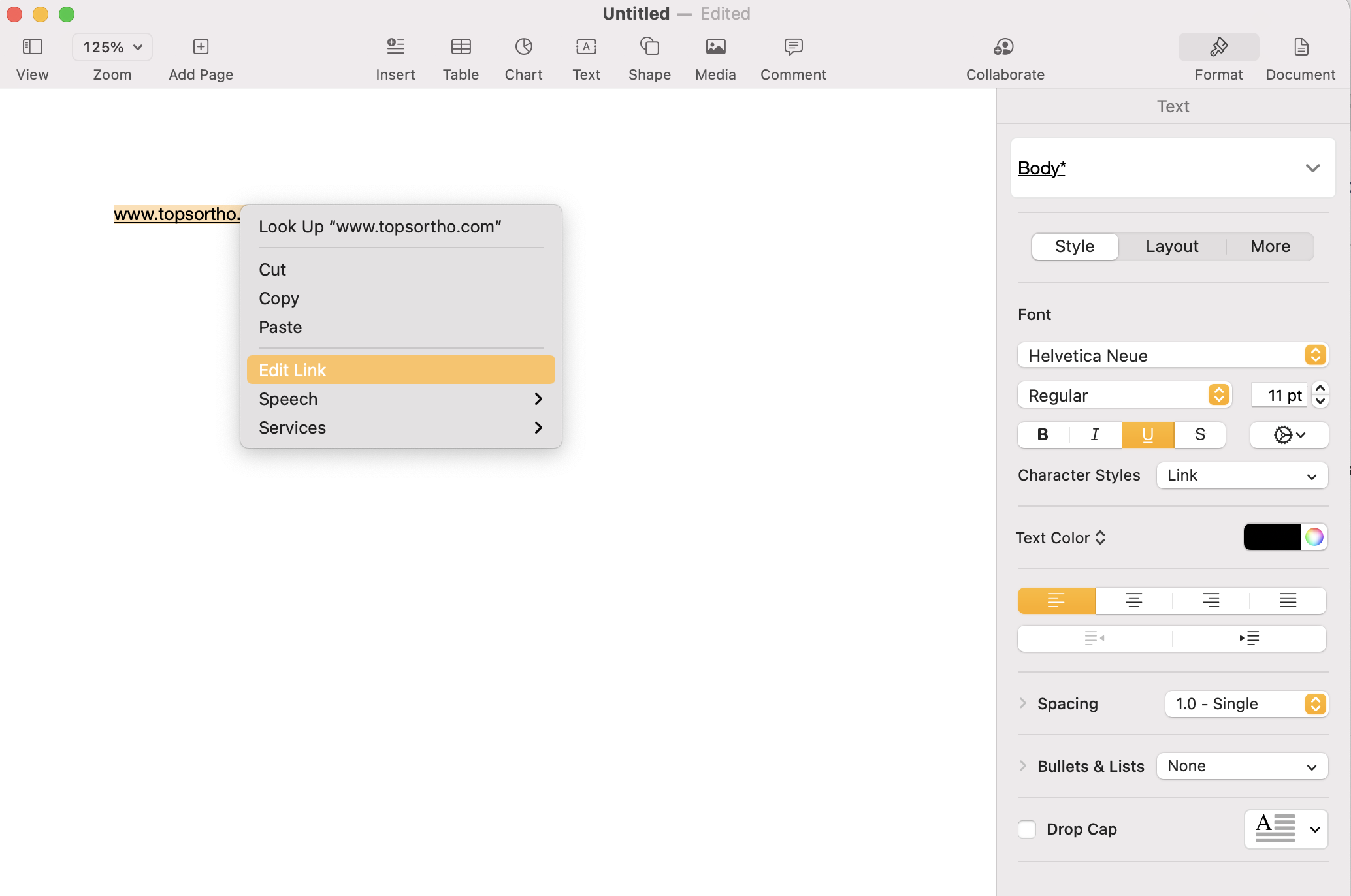 3. After you type the link in Pages, right click on the link and choose Edit Link