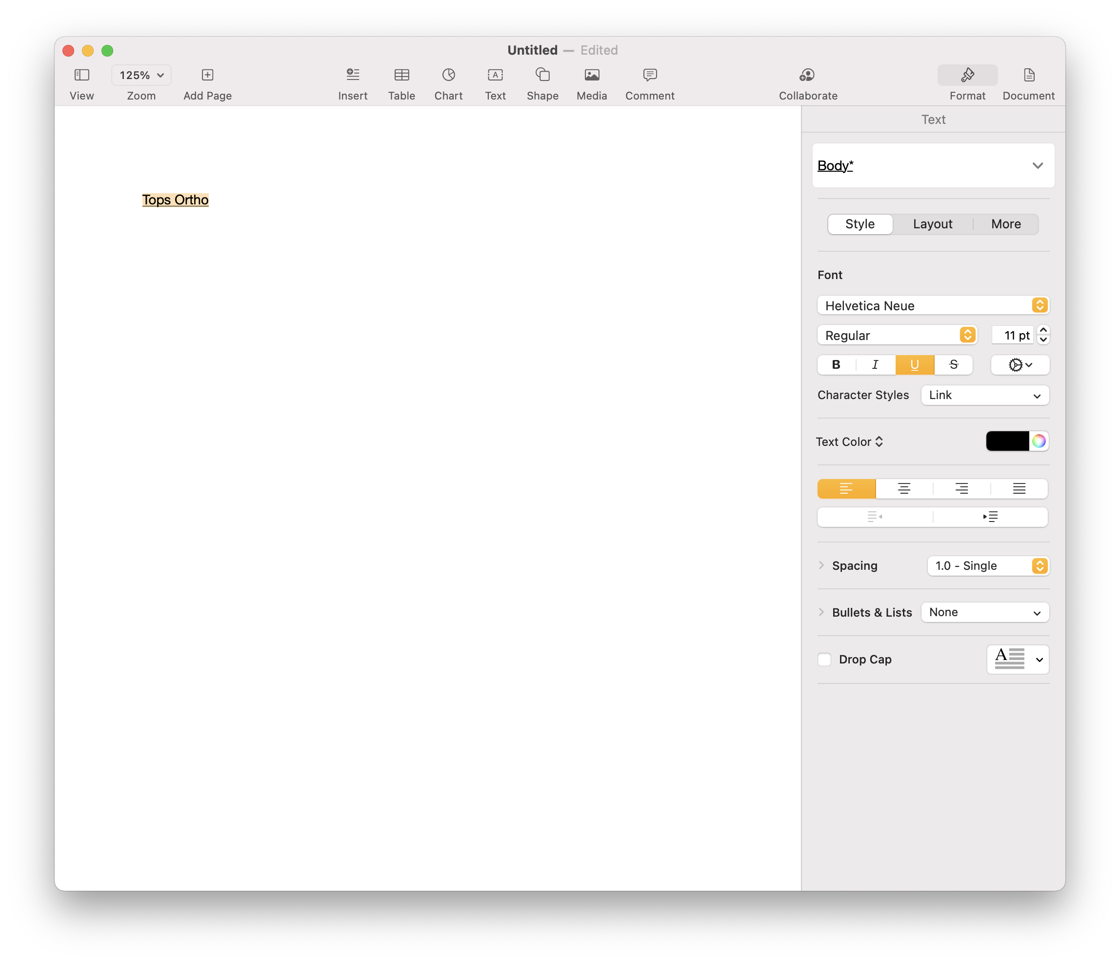 - From the Tops Ortho menu bar, select the Format menu. With the link highlighted, use the font palette to make the link blue and underlined. The link looks like it is already blue and underlined on the template but when you add it to a letter or statement, it is black. By making the link blue and underlined, it makes it easy for the patient to see that this is an actual link they can click on.