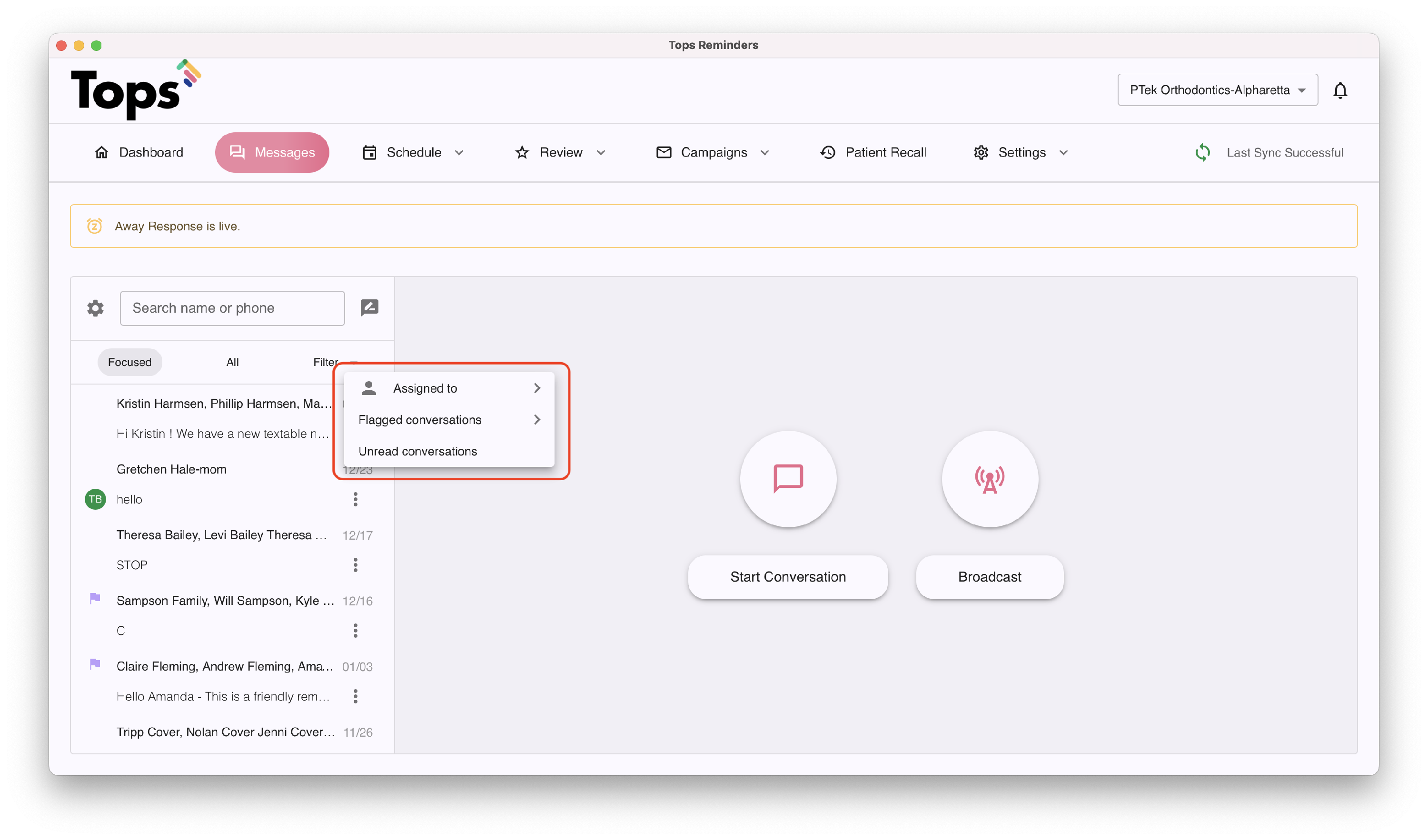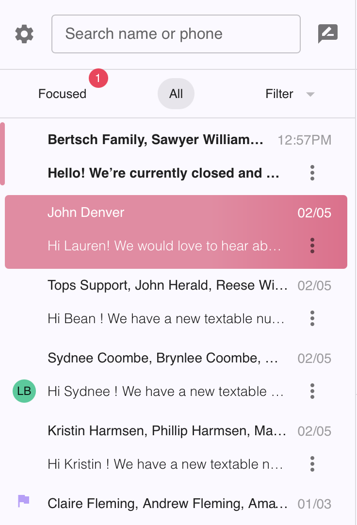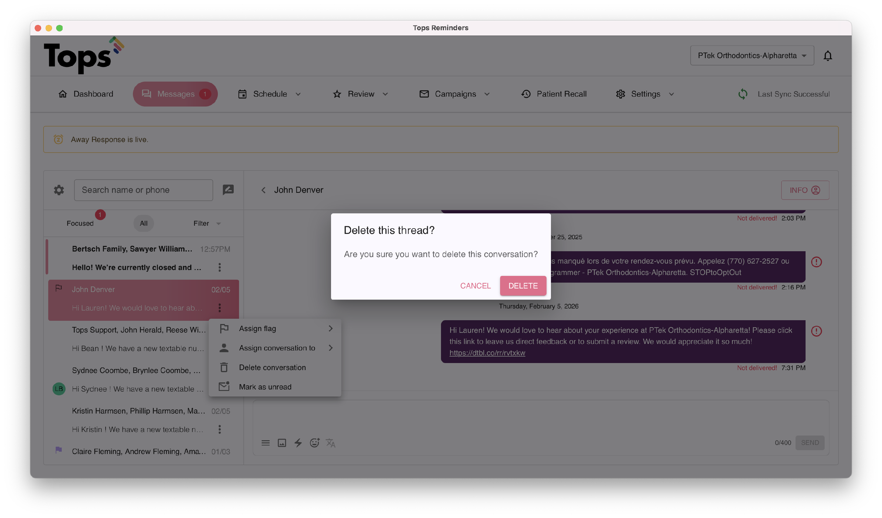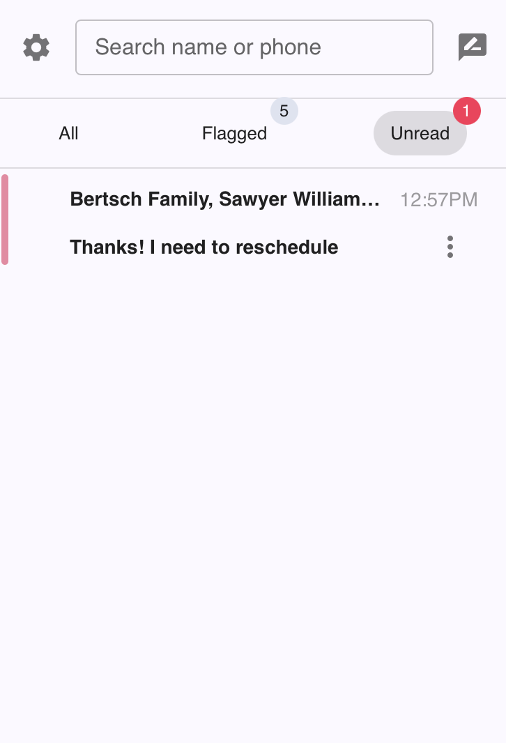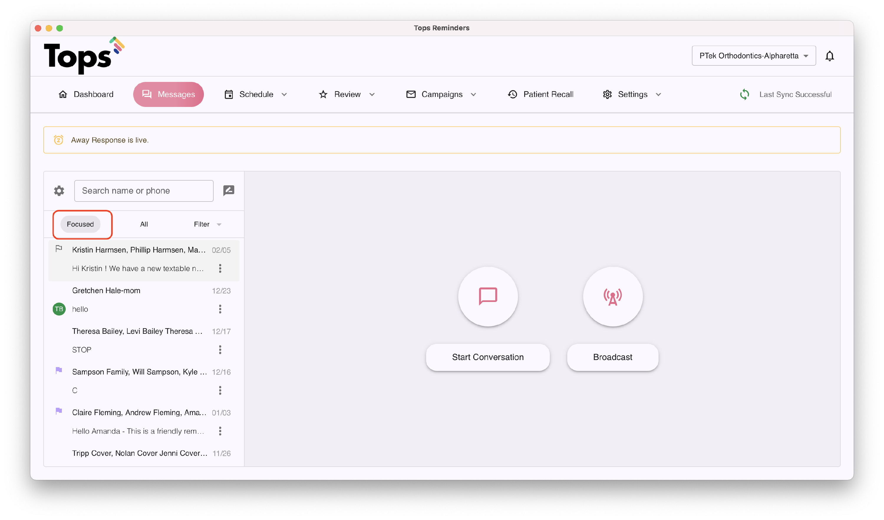 Message management is key when the Focus Inbox has been enabled. Once a patient or team member interacts using the texting feature, the patient will appear and remain in the Focused inbox until the text thread has been deleted. Once you delete the thread, the patient is removed from the Focused inbox. Their contact information can still be searched along with their history of automated messages.