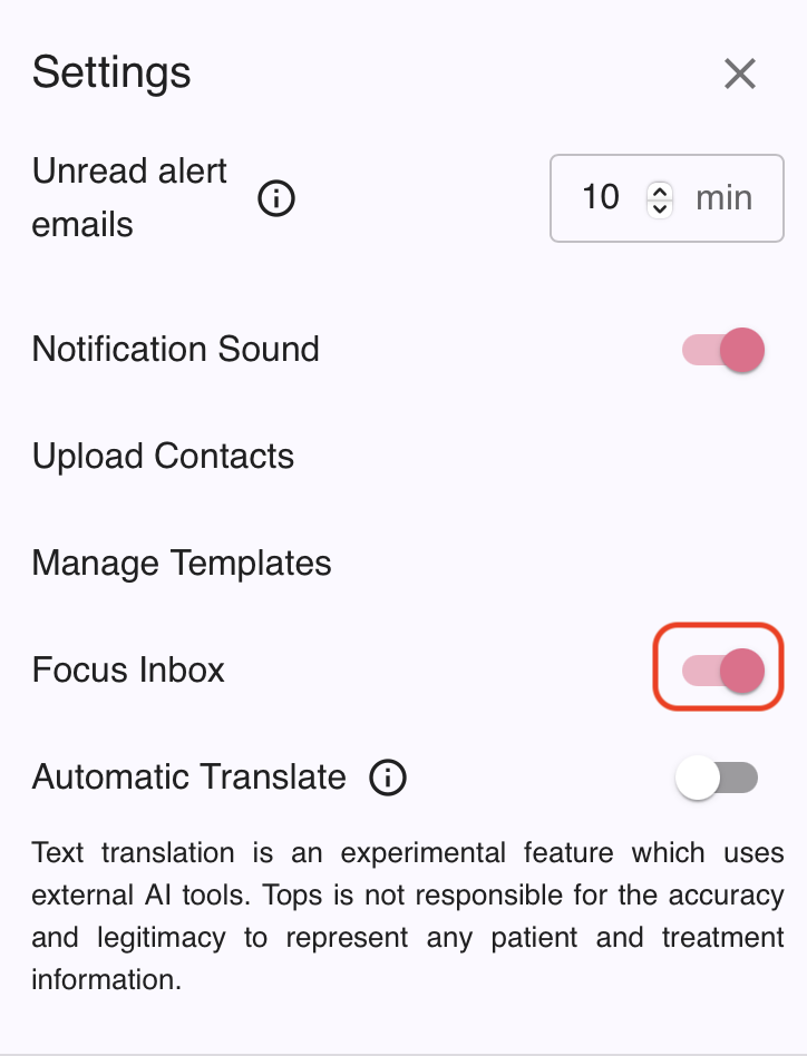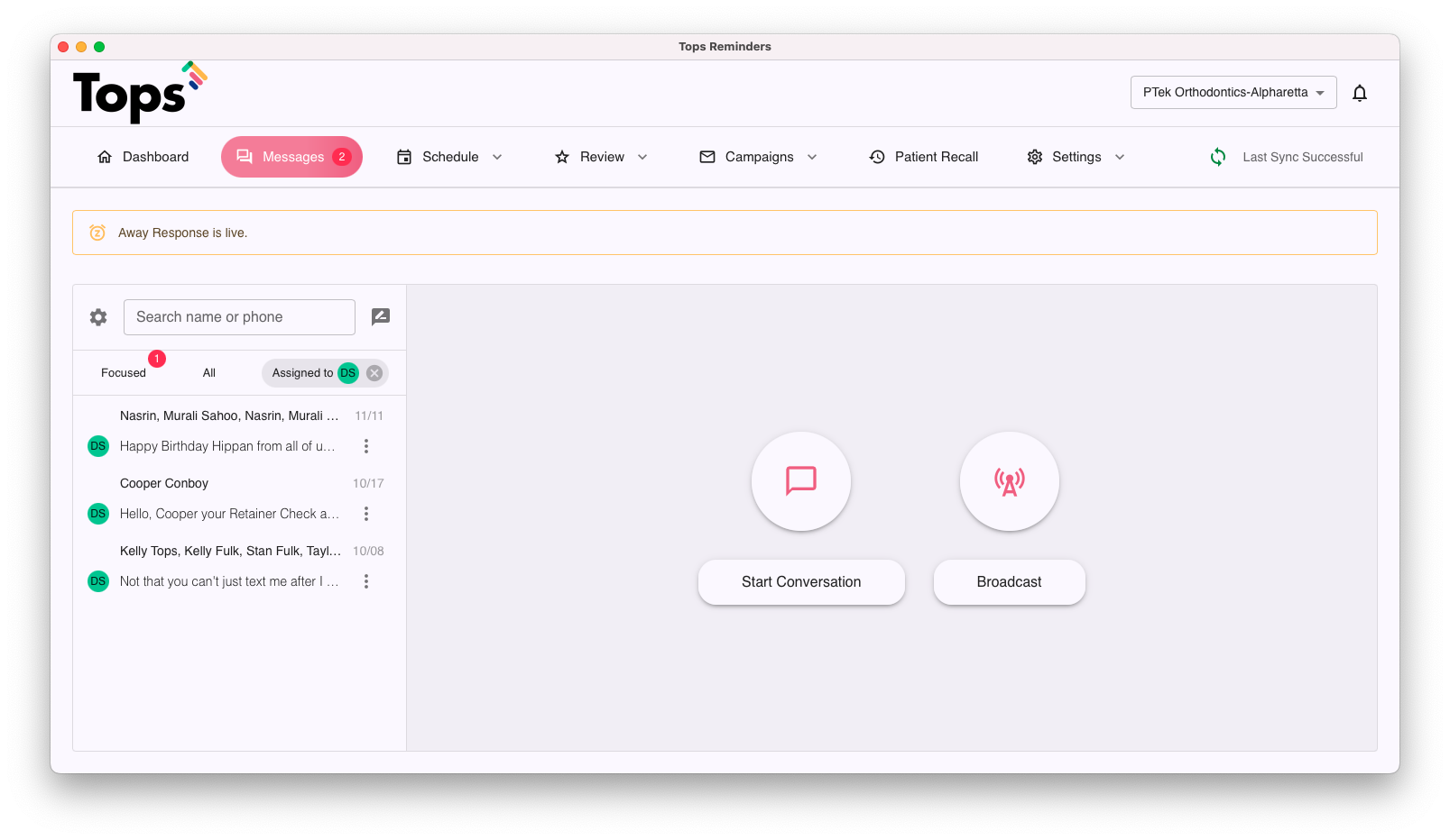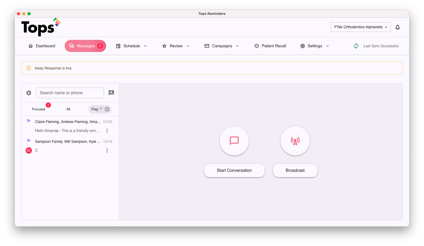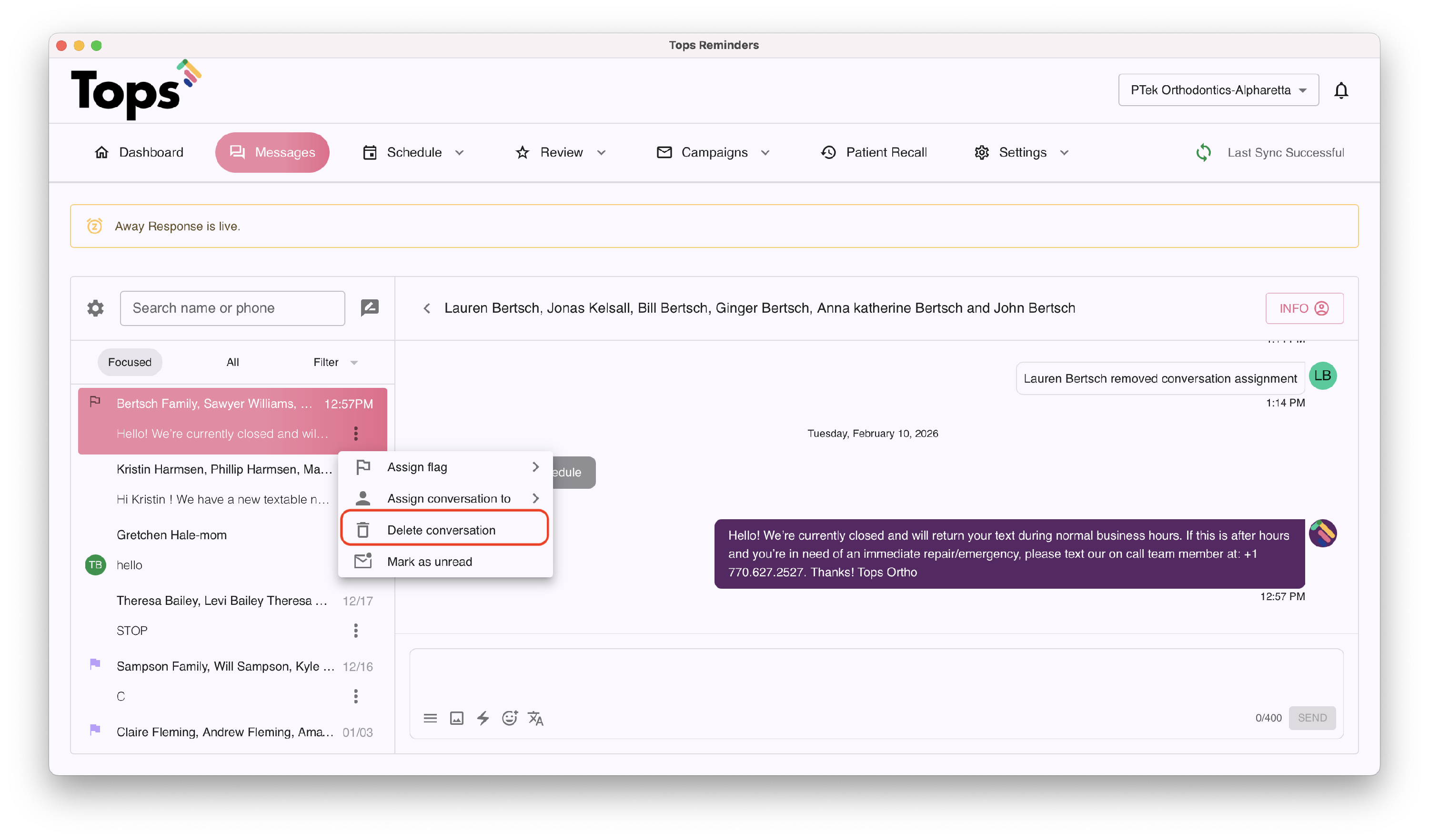 Message management is key when the Focus Inbox has been enabled. Once a patient or team member interacts using the texting feature, the patient will appear and remain in the Focused inbox until the text thread has been deleted. Once you delete the thread, the patient is removed from the Focused inbox. Their contact information can still be searched along with their history of automated messages.