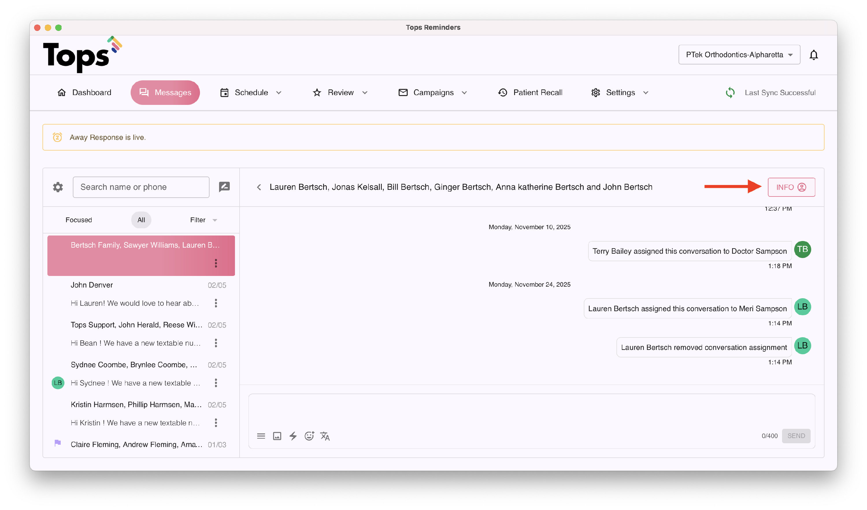 The conversation interaction between the user and the practice is permanently deleted. The automated message history, such as reminders and confirmations, are saved in the patient's TopsDPX record.