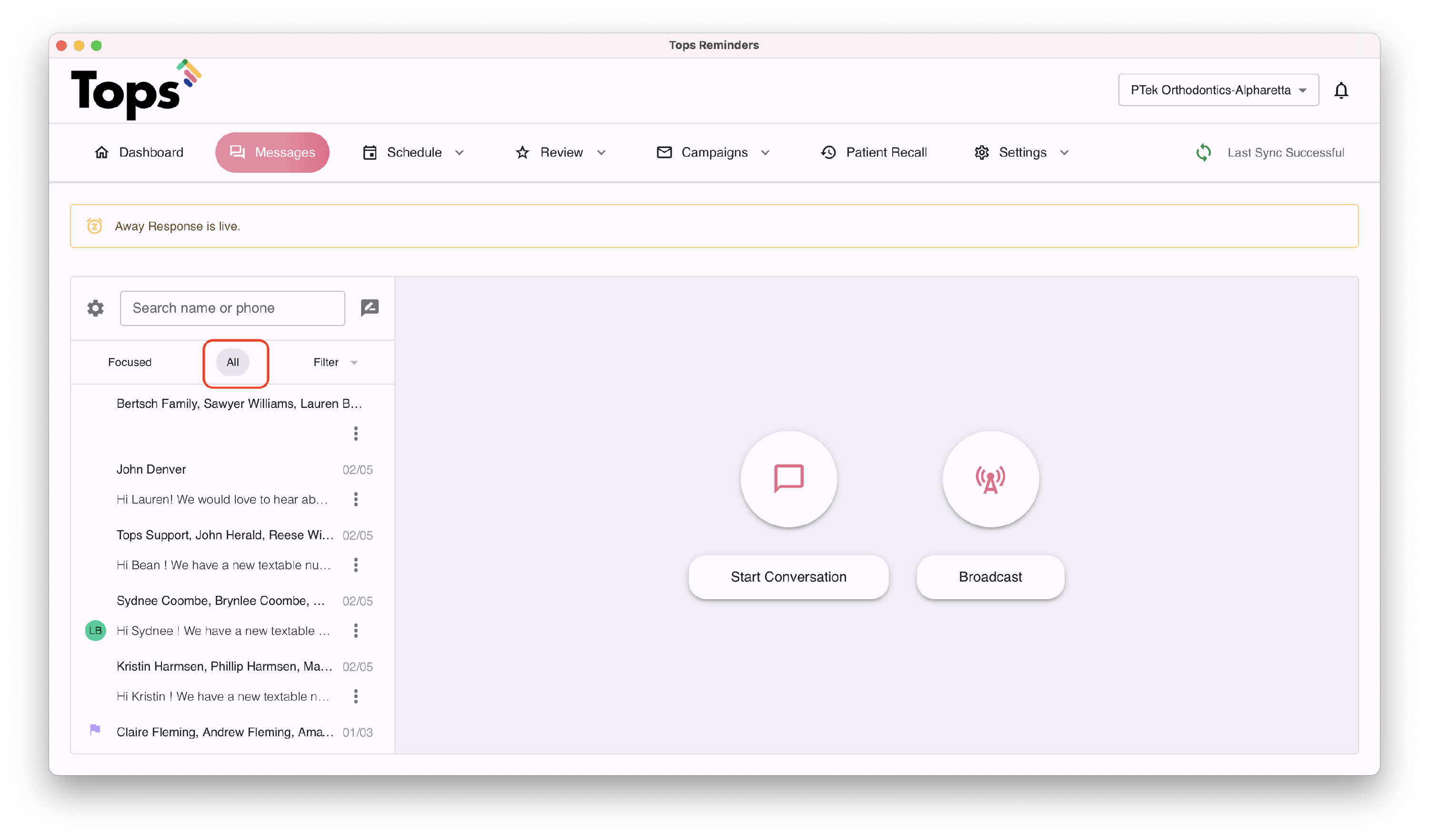The All inbox includes every patient that has received or responded to a text, including all outbound automated texts such as Reminders.