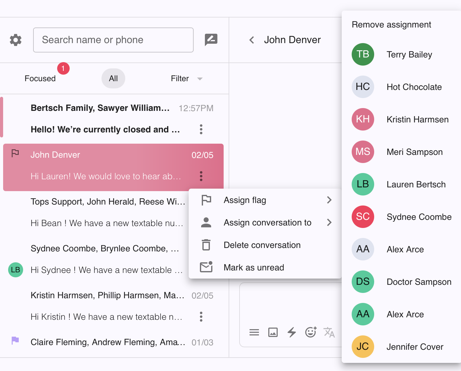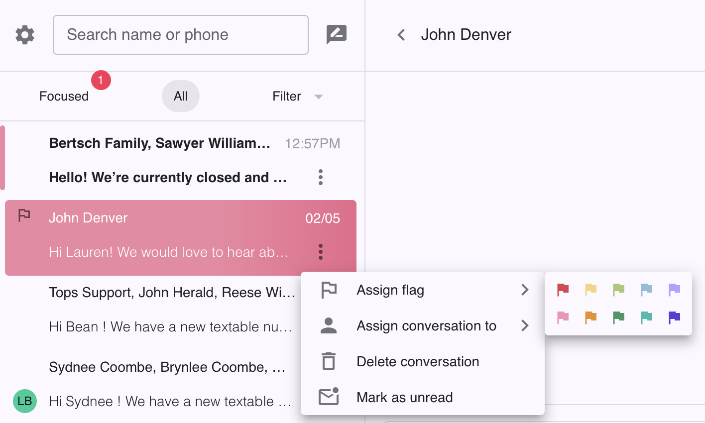 With Focus Inbox enabled, the Filter tab is activated. Any conversation that has been assigned a Flag or assigned to a Team Member can be filtered. Additionally, Unread conversations can be filtered.