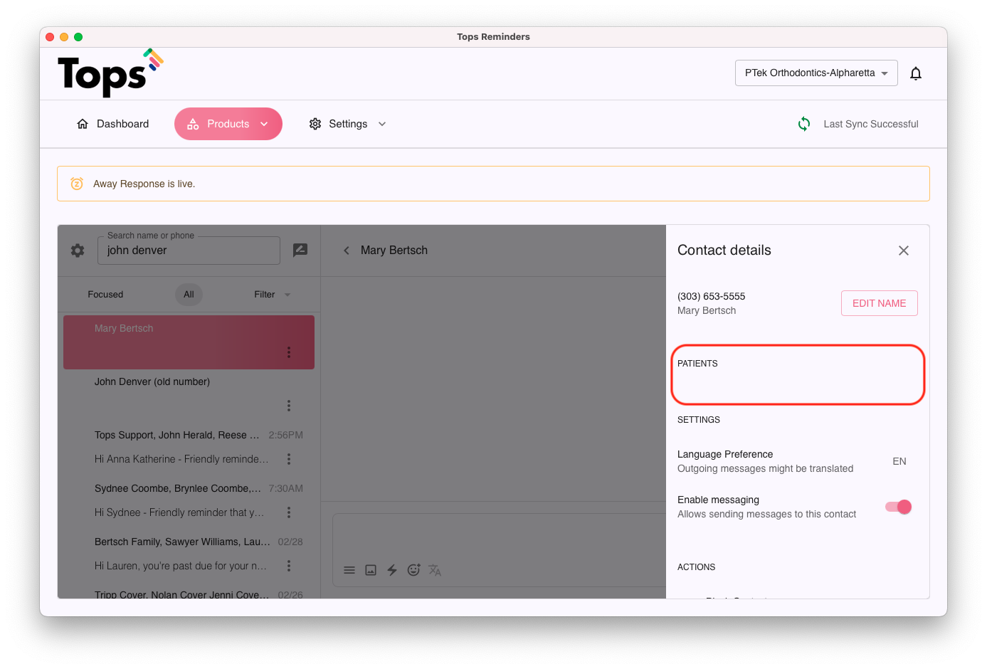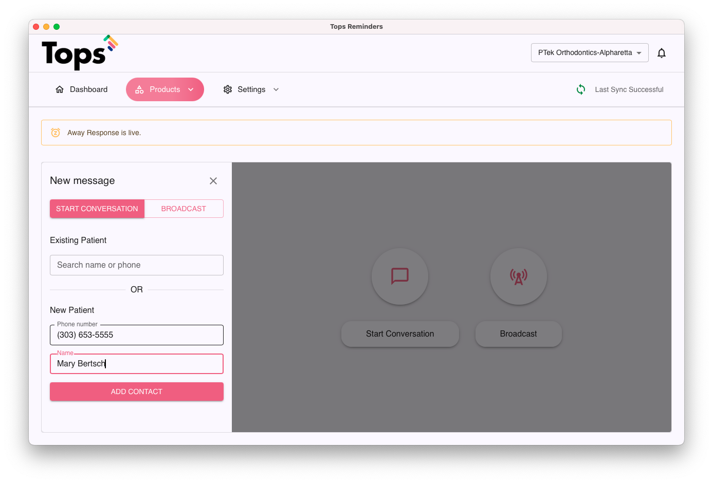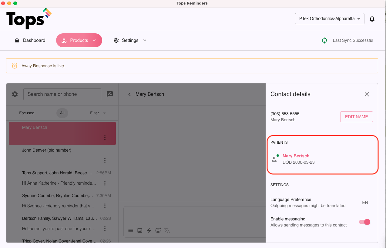 - If a patient record has not yet loaded, you can easily initiate a text to the patient or responsible party and save their contact details in the Messages tab of TopsDPX. Once a patient has an appointment upload to TopsDPX (up to 30 days out), as long as the phone number being used is the same as the one designated for their Reminders, the contact details will synch and a TopsDPX record will be created.