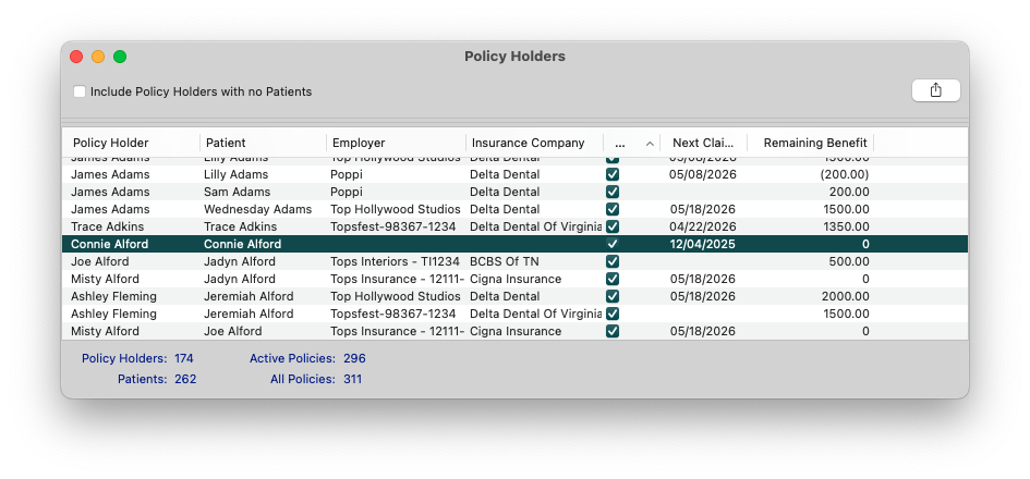 - Sort data to review insurance across all current and dismissed patients, regardless of status.