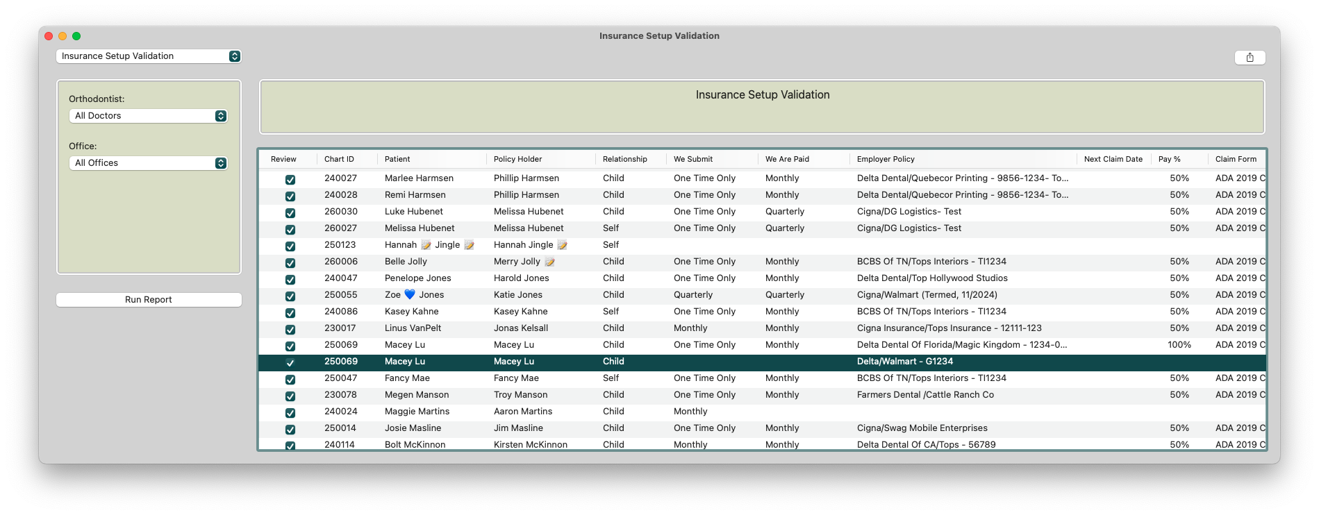 The Insurance Set-up Validation report allows you to view employer policies attached to patients. Navigate to Reports and then Insurance Set-up Validation. Use the Insurance Set-up Validation Report to review and correct any missing or incorrect data that could impact claims. More information is detailed below.