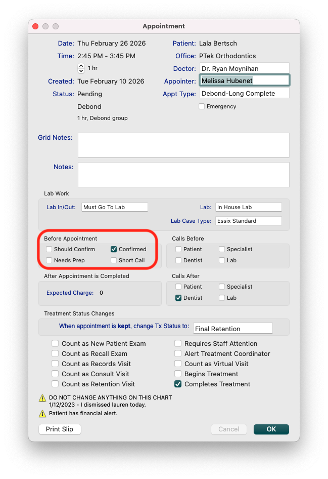 - In the Before Appointment section, place a checkmark in the Confirmed box.