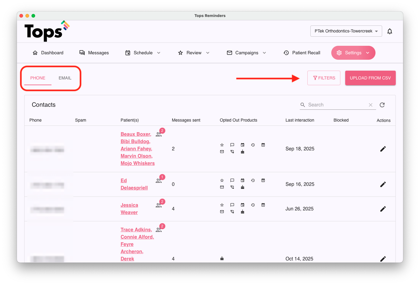 To view those patients that have opted out of phone or email services, click the associated tab to view the patients.