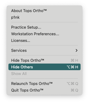 You can hide the current display of Tops Ortho from your desktop while working in other applications simply by accessing Tops Ortho > Hide Tops Ortho. The keyboard shortcut is Command H.