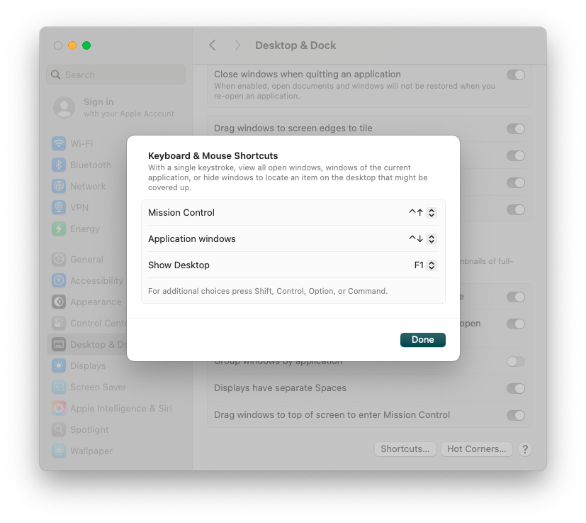 Click the Shortcuts button and assign F1 to Show Desktop